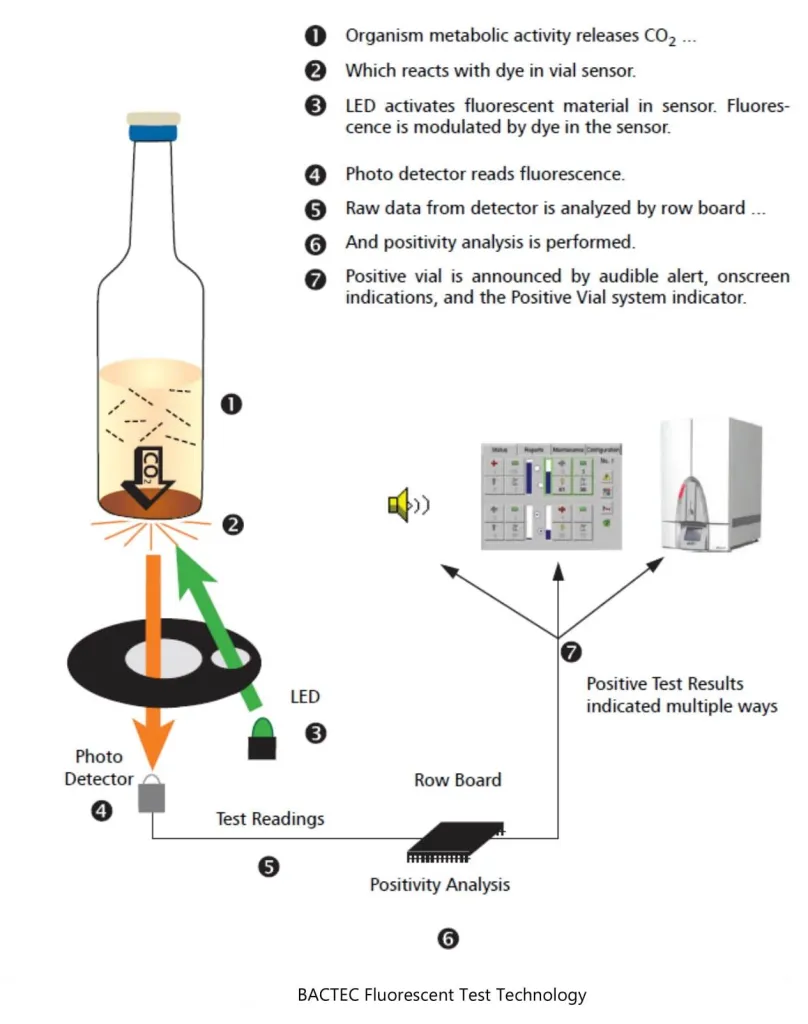 When microorganisms are present in the test sample inoculated into the BD BACTEC vial, they metabolize nutrients in the culture medium, releasing CO₂ into the medium. A dye in the sensor at the bottom of the culture bottles will react with CO₂. This modulates the amount of light absorbed by a fluorescent material in the sensor. The instrument’s photo-detectors measure the fluorescence level, corresponding to the amount of CO₂ released by the organisms.