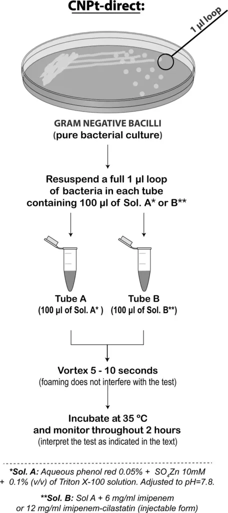 The Carba NP test (CNPt) is a biochemical test for the rapid detection (≤2 h) of carbapenemase production in Gram-negative bacilli. Clinical and Laboratory Standards Institute (CLSI) recommends Carba NP test for ensuring the production of carbapenemases in Enterobacteriaceae, Pseudomonas aeruginosa, and Acinetobacter spp with elevated carbapenem MICs or reduced disk diffusion inhibition zones, for epidemiological or infection control purposes.