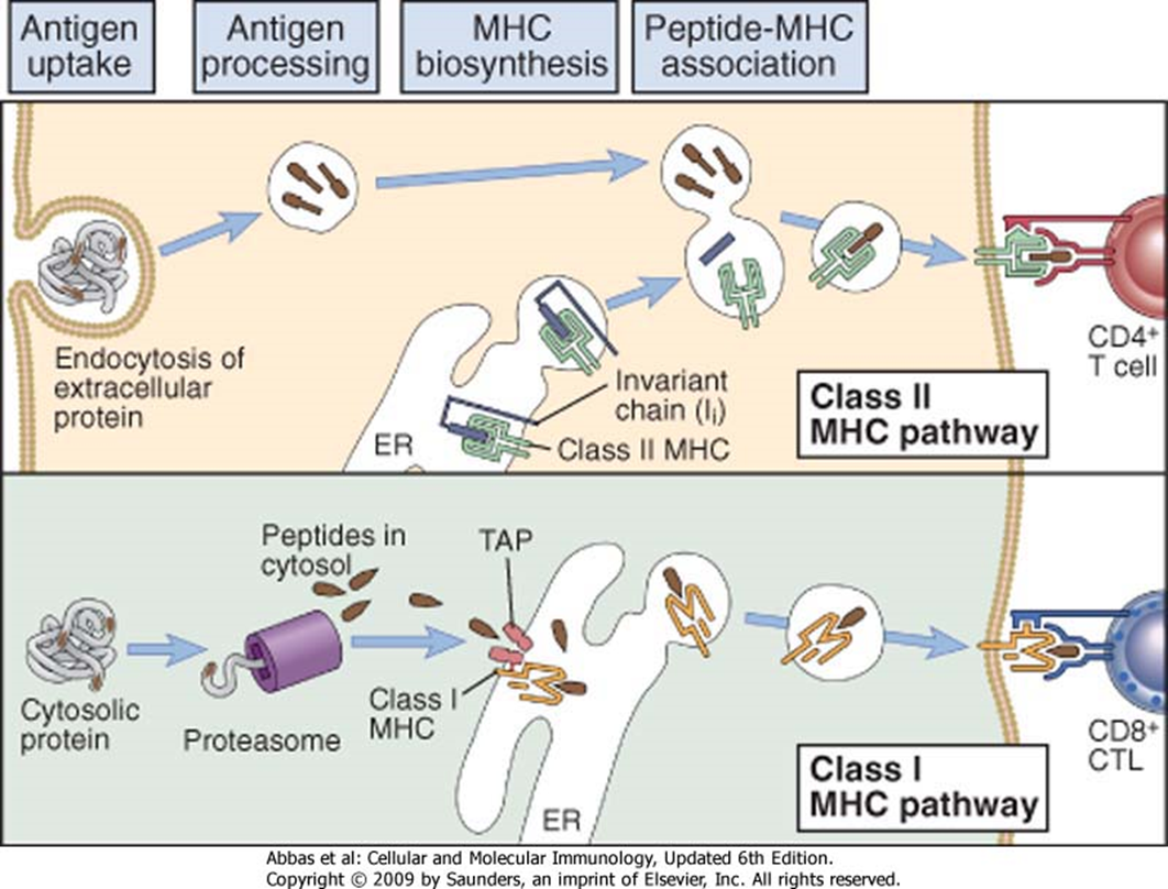 | Molecules involved in transport of peptides and loading of MHC molecules | Chaperones, TAP in ER | Chaperones in ER; invariant chain in ER, Golgi and MHC Class II compartment/Class II vesicle; DM |