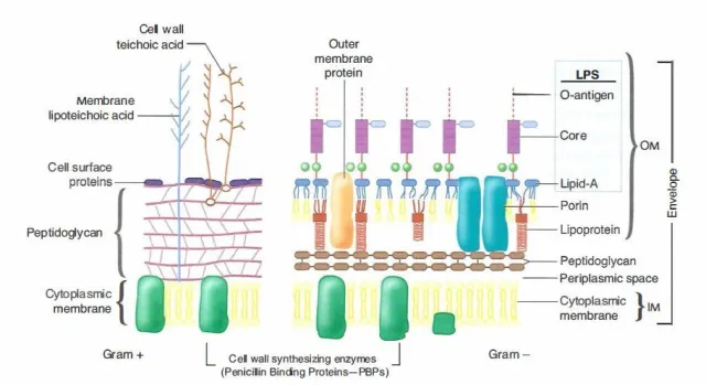 | Peptidoglycan layer | A thick (multilayered) peptidoglycan layer is present in Gram-positive bacteria. Â It accounts for 50% or more of the dry weight of the wall of some Gram-positive bacteria. | Thin (single-layered). Around 10% weight of the cell wall of Gram-negative bacteria. |