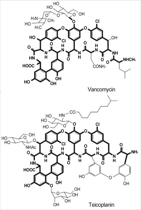 Glycopeptide antibiotics are believed to represent the last line of defense against the often lethal Gram-positive bacterial infections. Vancomycin remains the first-line drug against methicillin-resistantStaphylococcus aureus(MRSA); however, the emergence of resistance in enterococciand staphylococci has led to a restriction in the use of vancomycin as well as teicoplanin.
