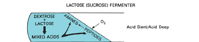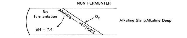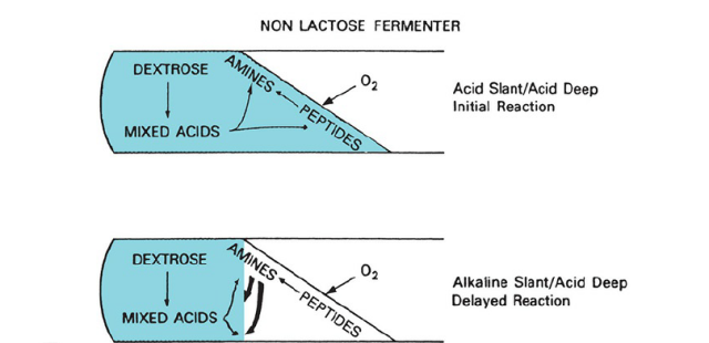 - Non-lactose fermenter i.e. **Alkaline Slant/Acid Butt (K/A):**Glucose is fermented but not lactose. This is characteristic of non–lactose-fermenting bacteria, such as Shigella species. Initially,  non-lactose fermenter does acidification of both the deep and the slant of the medium via the fermentation of the glucose but the slant reverts back to alkaline pH as alkaline amines are formed from the oxidative decarboxylation of peptides (derived from protein in the medium) near the surface.