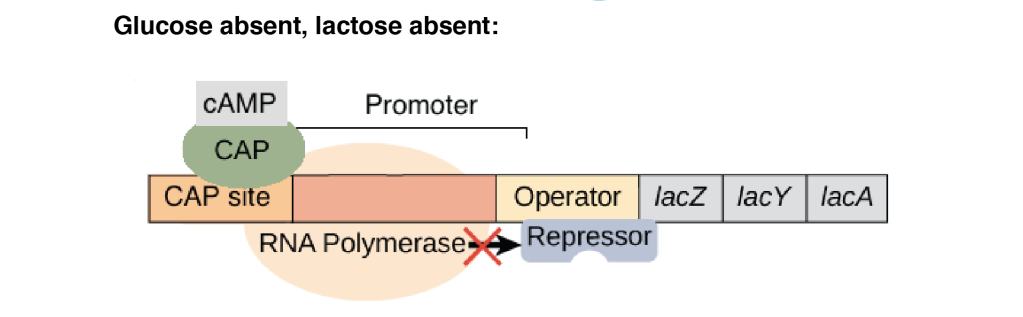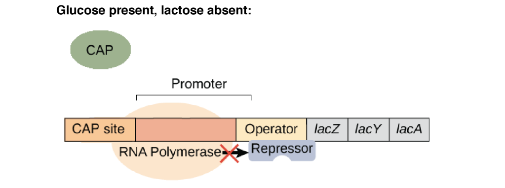 - **Glucose must be absent:**The level of cyclic AMP must be high enough so that the CAP protein binds to the CAP binding site. Bound CAP helps to attach RNA polymerase efficiently to the lac operon promoter.