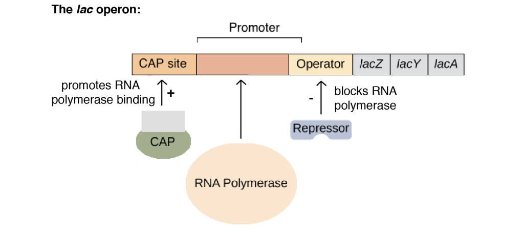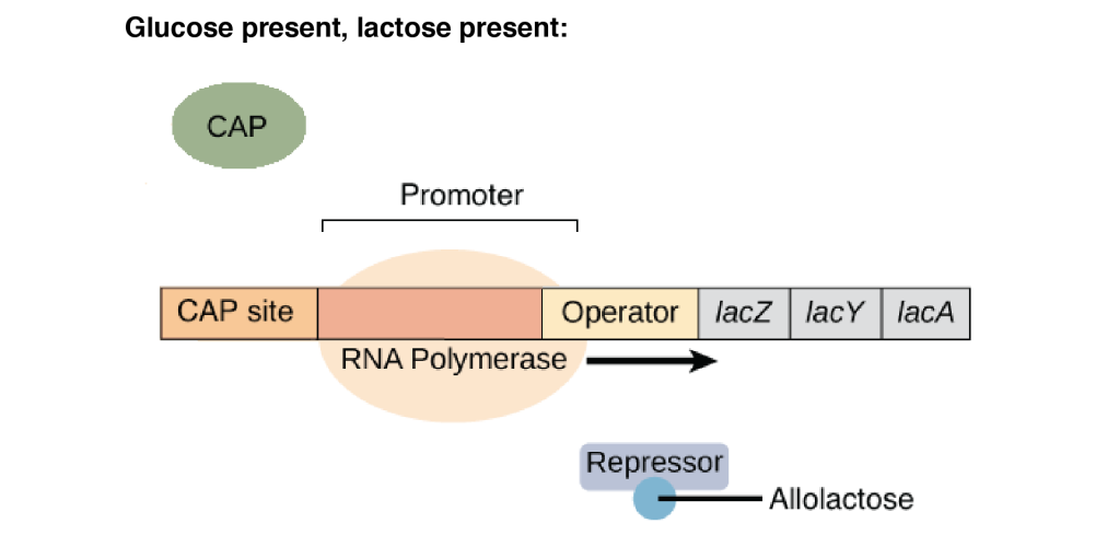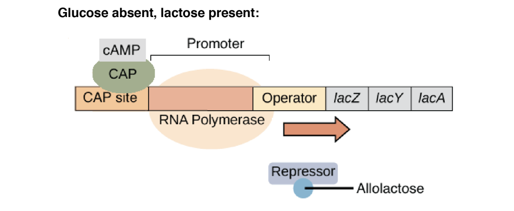- Lactose must be present: There must be an inducer (such as lactose) so that lactose repressor does not block transcription by binding to the operator.