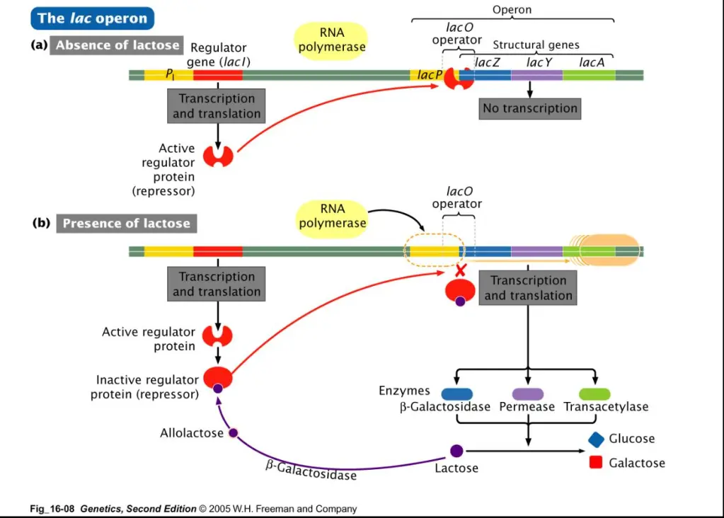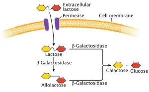 | lacZ | β-galactosidase (B) | It transforms lactose into allolactose and also catalyzes the conversion of lactose to glucose and galactose. |