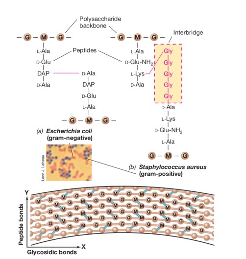 In gram-positive bacteria, cross-linkage may occur through a short peptide inter-bridge(e.g., glycine inter-bridge in Staphylococcus aureus) between L-lysine of one glycan chain and the D-alanine on the adjacent glycan chain.