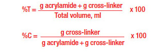 The polyacrylamide gel forms by polymerizing acrylamide and a crosslinking agent, i.e., N, N’-methylene-bis-acrylamide. It does not react with proteins and consists of pores and channels that allow the protein to move through it. Two parameters characterizes polyacrylamide gel: total monomer concentration (% T, in g/100 ml) and weight percentage of crosslinker (%C). Deferring these two parameters, helps in regulation in the pore size of the gel to yield the best separation result. %T indicates the pore size of the prepared gel.
