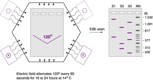 Application of an electric field that is periodically reorienting causes long DNA molecules to reorient during electrophoresis. The time required for reorientation is also inversely proportional to the size of the DNA fragment. As smaller molecules reorient more quickly than larger molecules, separation of various DNA fragment sizes ranging from kilobases to megabases ensues if the gel is run for a sufficient time. This process generates a fingerprint profile that can be digitally imagined.
