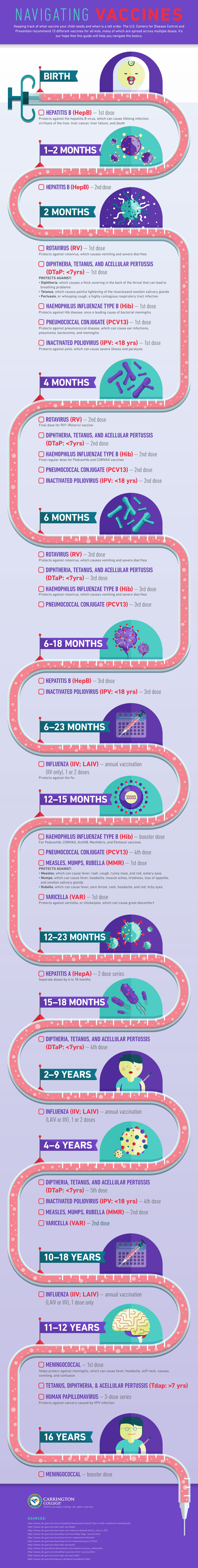 A vast array of childhood infections can be prevented by starting immunization early and sticking closely to the vaccination schedule laid out by the below childhood vaccination checklist created by Carrington.edu. This carefully researched schedule removes all doubt from the equation and ensures that children remain up to date with immunization. Some parents remain suspicious, however, as they don’t understand why the schedule is designed the way it is.
